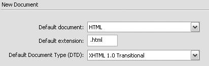 Figure 14.3. Select a default document, filename extension, and document type in the New Document pane of the Preferences dialog.  If you are new to XHTML, you will probably want to choose XHTML 1.0 Transitional as your default document type. XHTML 1.0 Transitional is the least strict of the XHTML document types.