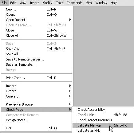 Figure 14.7. From the File menu, select Check Page > Validate Markup to validate the new file as XHTML.  It's a good idea to validate the new file. Although Dreamweaver's file conversions are usually accurate, if closing tags are missing in the HTML file, Dreamweaver may not be able to determine where the content of a tag ends. In this case, Dreamweaver may add closing tags at the wrong position in the code. You can check this by validating the filechecking the file to see if it follows the rules for its document type. These rules are defined in a Document Type Definition (DTD) file. The URL for the DTD file is included in the DOCTYPE statement.