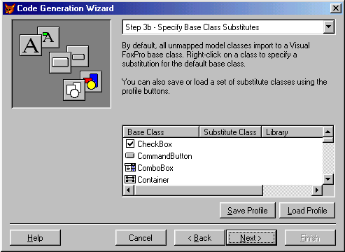 . Specify base class substitutes to use your own set of base classes.Step 3b allows you to substitute your own base classes for the default FoxPro base classes for each of the model elements. As we have discussed before, it is dangerous to inherit directly from base classes. In this dialog we can specify that the model use cMyExtraordinary-FormClass for all forms it encounters as it imports the model. To specify base class substitutes, simply right-click on the class you want to redefine and select a new class from the dialog.