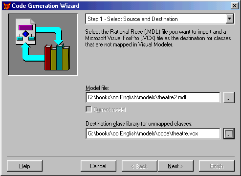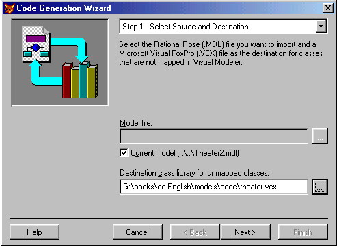 . In step 1 of the Code Generation Wizard, specify the modelFirst we specify the model file we want to import. We also specify a default class library where we want to store all the generated classes. (Note that the wizard creates only visual classes. If you wanted to see real source code, you'd have to use the Class Browser's source-generation feature to create low-level source code.) The specified destination file is only a default setting and might be overwritten in a number of places (see below). The library I specified in this example didn't exist, so the wizard automatically created it for me (after I approved it, that is).
