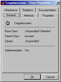The General tab contains some basic information such as the class name, base classes, parent class, the class library in which to store this class when implemented in Visual FoxPro, and whether the class should be implemented at all. You can also set these options in the model file (see below).