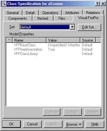 This might surprise you, because after all, neither Rational Rose nor Visual Modeler are Visual FoxPro-specific tools. Fortunately, both tools are quite extensible, which allowed the Visual FoxPro team to modify the Class Specification dialog in a generic way. The additional options are stored in a property file (see below).
