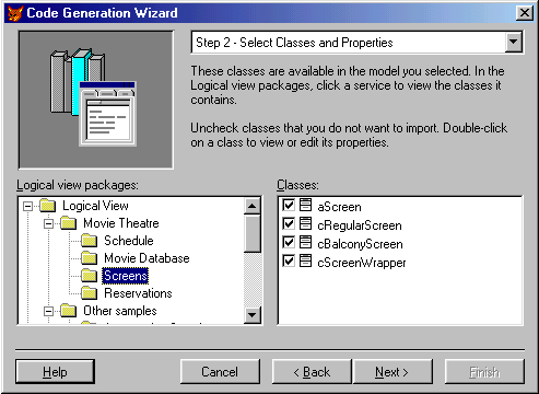 . The entire model has already been imported internally.The tree shows all the packages we created in our model. Once we select a package, we see all the classes belonging to it. Initially, all classes are selected. However, we can deselect classes if we don't want to import them. As you'll see later on, a lot of additional functionality is hidden in this step (see below), but for now we'll move on to step 3a (see Figure 6).