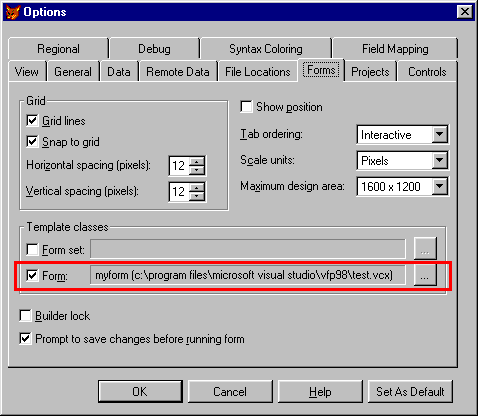 The other way is to define a default template in the Visual FoxPro Options dialog. The class you define there will be used for each CREATE FORM command, unless you specify a different class using the AS clause. Figure 1 shows where you can find that setting in the Tools/Options dialog.