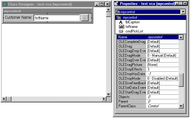 . A sample control class used in a form.Note that the property sheet for the form does not show the member objects of the control class just the objects on the form.