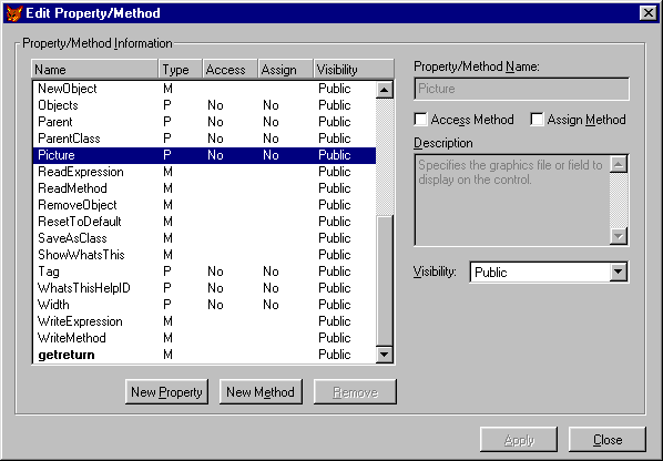 Using this dialog, you can create and delete new properties and methods, specify member visibility, and create access and assign methods. After using this dialog for a couple months, it was hard for me to imagine going back to Visual FoxPro 5.0 and living without it.