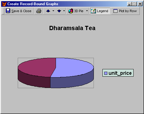 . The Graph by Record object rendering a 3-D pie chart using default settings.The rendered graph is a little rough. The caption (Record: 1) is not informative, and if the user decides to show the legend, the information isn't very useful. Luckily it's easy to define how you'd like your graph to look. The sample that ships with Visual FoxPro demonstrates this well. Figure 2 shows the form Graphrec.scx, which is located in the FFC subdirectory of the Visual FoxPro Solutions sample. Note that this is one of those places where the Foundation Class documentation is not only incomplete, but also wrong. The Automate.scx form does not have a Graph by Record sample.
