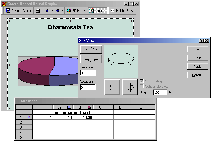 As I mentioned above, the Graph by Record object uses Microsoft Graph to render the diagram. This is done using Automation and inplace activation. (Inplace activation is one of the oldest parts of COM/OLE. Using inplace activation, another application such as Graph is embedded and activated in another document, such as a Visual FoxPro form.) As with all objects of that nature, the user can double-click on the object to activate it and utilize its entire functionality. For the Microsoft Graph object, this means that the user is able to modify the underlying data as well as a number of display options, such as 3-D angle, color, and the like. Figure 4 shows some of the possibilities.