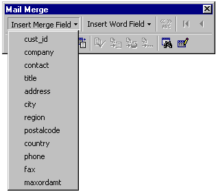 The Mail Merge class uses the specified data source by telling Word to open the specified data source using ODBC (or other mechanisms if ODBC isn't available). Based on this data source, Word creates a new mail-merge document. This document has a Mail Merge toolbar (see Figure