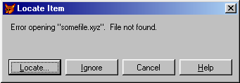 . The Locate Item dialog in action.When the user clicks the Locate button, a standard GetFile() dialog is displayed. The selected file is returned (see below). If the user clicks Ignore, the specified file name is returned. The Cancel button behaves quite differently it returns a NULL value. In order to make the Help button work, you have to set the HelpContextID property of the form.