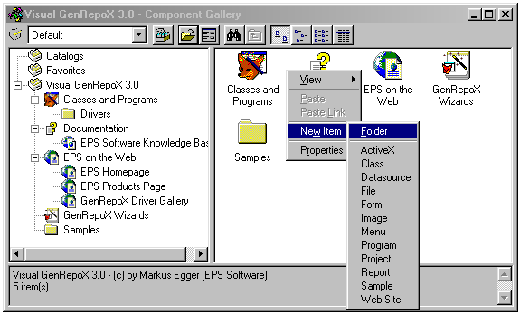 The next step is to create a couple of folders in the catalog. I would like to have folders for the Classes and Programs belonging to Visual GenRepoX, a folder for Documentation, another for Samples, yet another for the GenRepoX Wizards, and finally a folder that allows the user to browse the Web (EPS on the Web). To create a new folder, right-click the Details panel, select New Item, and then select Folder (see Figure 23). All folders listed above are relatively simple to create. You only have to change their captions, descriptions and icons.