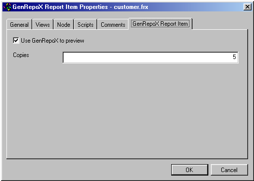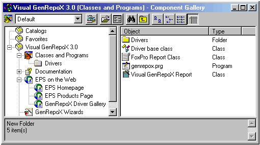 This first folder already demonstrates some of the strengths of the Component Gallery. The created folder provides an overview of the most important Visual GenRepoX components. Without the Component Gallery, you'd have to search through the Visual GenRepoX class library where you'd find a dozen classes, two-thirds of which cannot be used or modified by the user. Then you'd have to find the GenRepoX.prg, which is somewhere on the hard drive. Finally, there are several class libraries with various drivers. Using the Component Gallery is a lot easier. The created catalog shows only the important items, and all of them are in one place. But not only does the Component Gallery show all those items, it also allows you to work with them. The gallery is aware of the different kinds of items it shows, and automatically provides appropriate actions for those items when the user double-clicks or right-clicks on the item. If you go back to Figure 23, you'll see a list of items the Component Gallery is aware of. You can extend this list with your own items if you're missing one. I'll demonstrate this later, using the example of a special GenRepoX report.