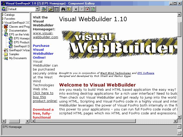 To fully understand the power of the Component Gallery, you have to create a catalog by yourself. I'll guide you through this process step by step. As an example, I'll use Visual GenRepoX, a public-domain tool I wrote to extend the functionality of the Visual FoxPro report writer. This tool is included with the Developer's Download Files at www.hentzenwerke.com, and future updates will be available from my Web site, www.eps-software.com. One problem with GenRepoX is that it has no real interface because everything happens programmatically. For this reason, many people have trouble getting started. The Component Gallery can help guide you through the tool. Not only is this an easy way for GenRepoX newcomers to learn, but it also allows experts to explore the whole GenRepoX functionality.