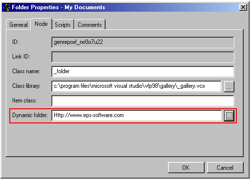 . A dynamic folder pointing to the Internet.To create a dynamic folder, you simply set the Dynamic Folder property in the Node tab of the folder's Properties dialog (see Figure 27). You can specify an Internet address (such as http://www.eps-software.com) or a directory on your hard drive (such as C:\My Documents).