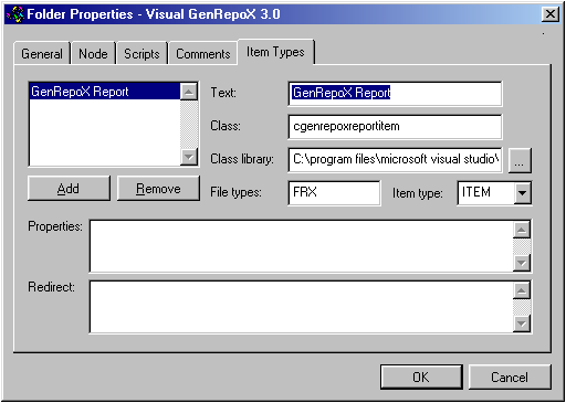 The strength of the Component Gallery is its flexibility, which is based on the great variety of different items the gallery can handle. The default list of items already handles the most important item types. However, you might want to introduce your own items. A good example is the Visual GenRepoX catalog created above. Even though Visual GenRepoX reports are regular FoxPro reports, they have to be executed slightly differently in order to allow GenRepoX to handle things differently and to extend the report writer's functionality. For this reason, you have to create a special item type that has the ability to execute those special reports. Later I'll explain how to do that, but before you can create our own items, you should understand how the Component Gallery handles item types.