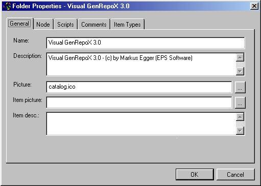The variety of options in each property sheet is discussed below. For now, we are only interested in changing some options in the General tab. Here we can change the name, the description and the picture for the catalog. Note that the caption of the dialog is "Folder Properties", even though we are looking at the catalog properties. I'm told this is by design. However, note that this property dialog is essentially different from the property dialogs of the subfolders.