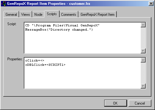 Figure 34 shows how this is specified in the property sheet. Take note that you can specify only one script in a property sheet. If you wanted to create another script for a different event, you'd have to add another record to the component catalog something you could only do low-level in the DBF file. Additional script records have the type SCRIPT, a unique item ID that will be used to reference the script, and the actual script in the Script field. Let's assume you created a script record with the ID SCRIPT1. You would call this script with the following setting in the properties: