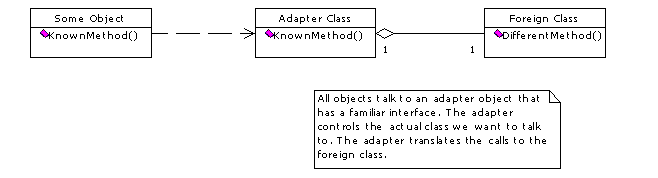 Consider the movie theater example. We used a screen class with methods that we needed to maintain a screen. Later in our example, we took over another theater that had a well-organized software system, and we wanted to incorporate the screen manager classes of that system. As expected, those screen manager classes weren't compatible with ours. However, we could still use those classes if we wrote an adapter. Figure 1 shows the general idea.