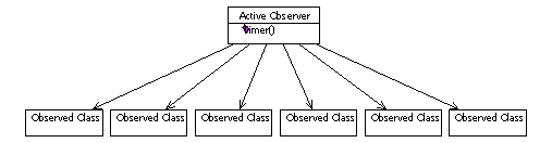 . Active observer diagram.Active observers (or "pop observers") actively monitor the status of other objects. In Visual FoxPro, they are usually implemented as timers. The major advantage of active observers is that other objects don't have to know they are observed (for this reason, active observers are sometimes referred to as "voyeurs"). My Class Browser example is a typical use of active observers. Typically they are used to enhance a system that wasn't designed to be easily enhanced, and to overcome design shortcomings.
