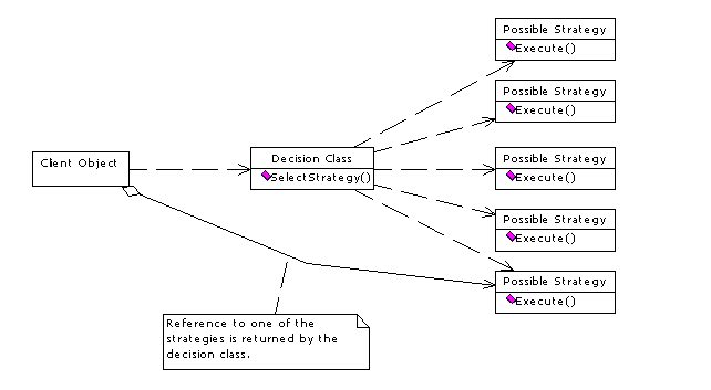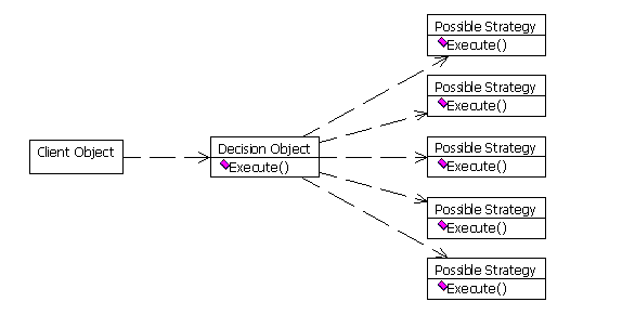 . The decision object is a container that owns all possible strategies. To the client object, the construction looks like a single behavioral object.This version is harder to maintain than the three-object architecture, but it's easier to use from the client's point of view because all messaging goes through the decision object. This means that the caller doesn't retrieve a reference to the actual behavioral object and therefore needs no knowledge about it. You can use this approach quite easily if you want to add strategies to an existing component.