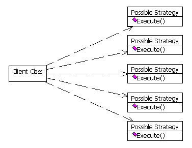 Implementations of the strategy pattern vary greatly. In small scenarios, the object that requires some behavior actually makes the decision of what object to invoke (see Figure 6). However, this architecture takes away many advantages of this pattern, mainly because this object must be changed in order to enhance the number of invoked algorithms. I generally do not recommend this approach (even though I sometimes use it myself in very small scenarios).