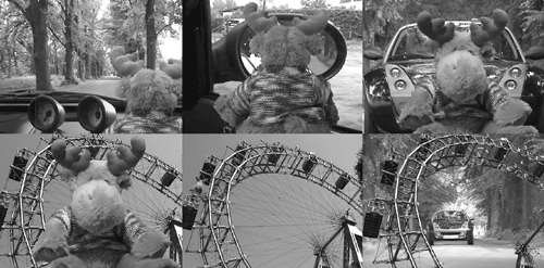 | Tip Chroma Keying on the Cheap Although I said that you need professional equipment to produce professional results, you can still experiment with chroma keying without having access to a large budget. To create the examples shown in this chapter, I printed off several sheets of green paper. I stuck these to the wall and tried not to leave gaps or create any ripples in the paper. Then, I just added a bright light source or two to eliminate shadows and voilàEdy the Elk is now a movie star (Figure 14.41). Figure 14.41. Edy the Elk and the Smart Roadster show how easy it is to create a green screen set at home and from suitable clips.