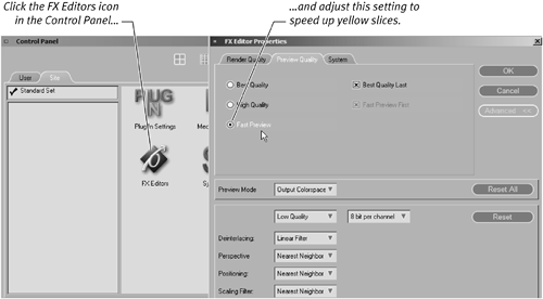 Playback Problems If you see a stuttering frame when you're playing back yellow slices, it's probably because your system doesn't have a fast-enough CPU to cope with showing effects in preview quality. You can get an idea of how bad the playback is by monitoring the speed playback readout in the Liquid Edition taskbar (Figure A.1). Speed up playback under yellow slices by making sure no unnecessary programs are running in the background that are stealing resources from Liquid Edition. Alter the quality setting in the FX Editors area of the Control Panel (Figure A.2). Figure A.2. Altering the FX settings may help speed up playback of Realtime effects.