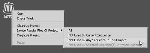- Not Used By Selected Sequence(s) In Project Window: To delete any render files from sequences you have not highlighted before right-clicking the Trash can.