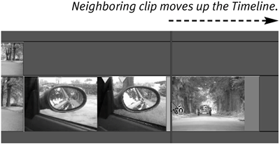 Any neighboring clips to the immediate right shuffle down the Timeline so that no gap is created.