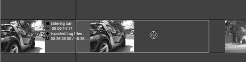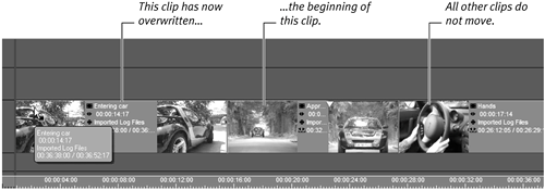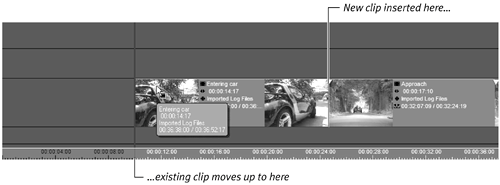 Edit Styles Liquid Edition has two edit styles that affect the way clips behave on the Timeline: Overwrite Style and Film Style. You can change between these by clicking once on the toggle button that sits between the Source and Master/Timeline Viewers. Overwrite Style: This is the default setting when Liquid Edition is launched. It does pretty much what it says on the boxany clip you send or drag to the Timeline will overwrite the clip(s) at the timeline cursor's position. Figures 6.29 and 6.30 show a new clip, Entering car. It is brought into the Timeline and overwrites the first few seconds of the Approach clip. Figure 6.29. A new clip dragged onto and over the first clip on the Timeline.  This is the default editing style. Clips sent to the Timeline do not affect the order or (more importantly) the audio synchronization of the other clips. Figure 6.30. Once the media clip is dropped, the beginning of the original Timeline media clip is overwritten.  Film Style: This mode is slightly more complex, and using it on a crowded Timeline is slightly risky. Primarily, you'll use Film Style to insert a clip without losing any footage from any clips already on the Timeline. However, because added clips will move any existing clips to the right (or "up" the Timeline), to make room for any new clips, you can lose audio sync if not all of the tracks are active (see the "Audio Sync Issues" sidebar for details). Figure 6.31 shows the Entering car clip dragged to the mark-in point of the Approach clip. Once it is placed here, all other clips to the right move up the Timeline. Figure 6.31. In Film Style, all other clips will move when a new clip is placed on the Timeline.  Figure 6.32 shows what happens if the same clip is sent to the start of the Timeline. When you release it, all the clips move up to make room for this new clip, but a gap is also created. This is because gaps are also included in the Timeline when you are using Film Style. Figure 6.32. Gaps are counted as Timeline elements when in Film Style.  If you try to close this gap by dragging one clip toward the other, you will see a No Entry symbol (Figure 6.33) indicating that this is not allowed. In fact, you can only drag clips "down" the timeline when you're in Film Style. To move them the other way, you have to switch back to Overwrite Style. Figure 6.33. Dragging a clip up the Timeline toward other clips is not allowed in Film Style.
