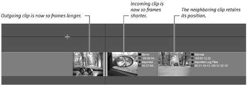 | Tips This procedure is identical when selecting just the incoming or just the outgoing clip and the results are the same. Only those clips being trimmed will be affected; the rest of the Timeline will remain intact. Again, you cannot trim beyond the maximum length of a clip.