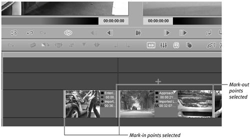 The mark-in and mark-out points for the selected clip(s) become highlighted.