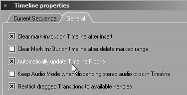 Automatic Picon Update By default, Liquid Edition updates the heads and tails of each clip automatically. If you have a slightly slower system, this may cause you considerable performance problems when you're trimming a clip on a particularly crowded Timeline. To turn off the automatic updates, simply right-click anywhere in the Timeline and select Timeline Properties from the pop-up menu. Then, switch to the General tab and uncheck the Automatically update Timeline Picons box (Figure 6.40). Figure 6.40. Manually updating the heads and tails.