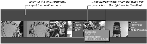 | Tip Sending to an occupied Timeline Sending to a Timeline that already contains clips is basically the same process as sending to an unoccupied Timeline; however, here the Overwrite Style and Film Style rules need to be observed more carefully. As you will recall from the "Edit Styles" sidebar earlier in this chapter the basic difference between these two styles is that Film Style shuffles the already existing clips up to make room for any new clips you insert, while the Overwrite Style simply writes over the existing clips. Which one you use will depend on what exists on the Timeline. Tip To insert a clip in Overwrite Style Do one of the following: - Place the timeline cursor on an empty part of the Timeline but with a clip directly to the right and click the Insert Source into Master button