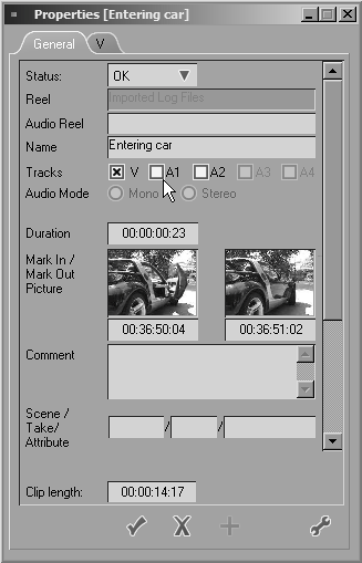 | Tip Unwanted Audio Tracks In this three-point edit example, the original audio was disbanded and was not overwritten. However, you may now have inserted a media clip containing audio that you don't want. To turn this off, you need to right-click the media clip in the Timeline, select Properties, and deselect any audio boxes that are not grayed out. Figure 6.57 shows the properties for Entering car with the audio tracks A1 and A2 deselected. Figure 6.57. The media clip's Properties screen with audio tracks deselected.