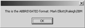 Dim s As NotesSession Dim person As NotesName Set s = New NotesSession Set person = New NotesName(s.UserName) Msgbox "This is the ABBREVIATED format: " & person.Abbreviated