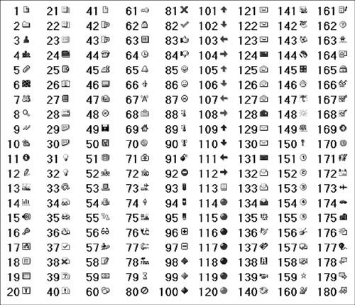 To display a view icon, two items must be setthe column property and the column formula. To display an icon for any given column, you must select Display values as icons in the properties dialog. Additionally, the column formula must equate to a corresponding icon value. There are 180 default icons provided with release 7 that can be displayed in a view column (see Figure 15.2). These icons are automatically included with Lotus Notes and cannot be changed.