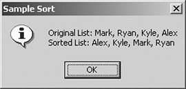 myValues := "Mark" : "Ryan" : "Kyle" : "Alex"; result := @Sort ( myValues; [Ascending] ); @Prompt([Ok]; "Sample Sort"; "Original List: " + @Implode(myValues; ", ") + @NewLine + "Sorted List: " + @Implode(result; ", "))