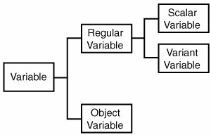 Variables are used to store data and can be classified into two primary categoriesregular variables and object reference variables. A regular variable is used to store a literal string as the program executes. This type of variable can be subdivided into scalar and variant variables.
