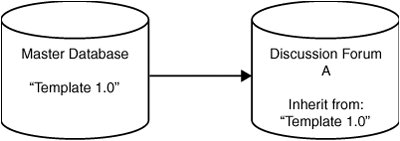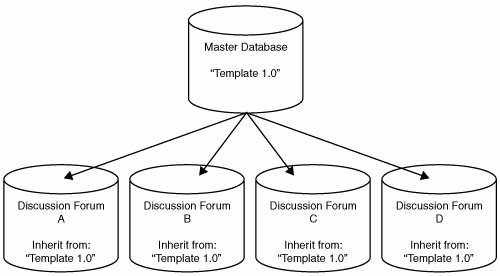 Another advantage to this approach, as implied previously, is that it allows multiple databases to be updated from a common (or central) design. Lets say you have multiple discussion forums. Although each forum is used for a separate discussion thread, the underlying design of the database remains the same. Using the master design template, you can change the design once and apply the changes to all related databases (see Figure 20.4).