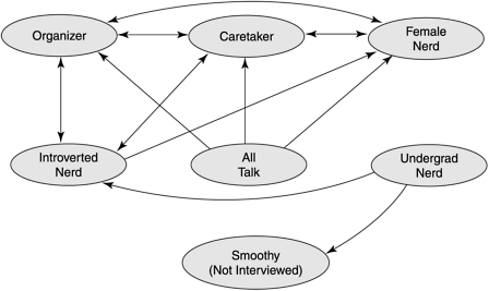 The team has three isolates and one subgroup of four. One isolate was not interviewed so his choices were not known. Pseudonyms were given team members based primarily on the role they played in the group. All Talk, Undergrad Nerd, and Smoothy were the three isolates, all male. The four in the subgroup were Caretaker, Organizer, Female Nerd, and Introverted Nerd.