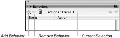 There are two different places where you can add a behavior: on a keyframe or on the instance itself. The behaviors that you can add depend on what it is you have selected. For instance, some behaviors can't be added to frames, so they won't be available. Others can only be associated with buttons. You'll see what you can add when you press the Add Behavior (+) button and make choices from the drop down and fly over menus.