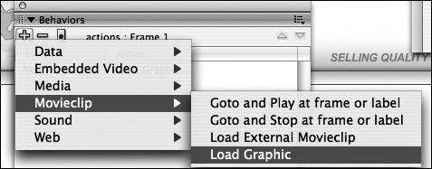 Select Frame 1 of the actions layer and open the Behaviors panel. If it is not already open, select Window > Behaviors. With Frame 1 selected, click the Add Behavior button in the Behaviors panel and select Movieclip > Load Graphic from the Add Behavior menu.