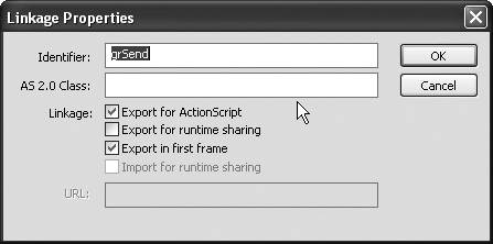 In the Linkage Properties dialog box, select the Export for ActionScript check box in the Linkage section of the dialog box, which allows you to enter an identifier in the text fields at the top of the window. grSend should show in the Identifier field by default. If not, enter grSend into the Identifier field and leave the AS 2.0 Class field empty. Click the OK button to return to the Stage.