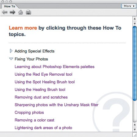| What if you want more power than GraphicConverter offers? Look to the $90 Adobe Photoshop Elements, the baby brother of industry heavyweight Photoshop. Learn more about it at www.adobe.com/products/photoshopelmac/. Reasons you might want Photoshop Elements:Some of Photoshop Elements' tools, like Red-Eye, are more capable than iPhoto's. Photoshop Elements enables you to select and edit portions of a photo in easier and more powerful ways than is possible in GraphicConverter. Photoshop Elements offers a helpful set of "recipes," or canned procedures that walk you through fixing photos in common ways. The recipes are useful in their own right and help you learn how to use many tools in Photoshop Elements (Figure 4.62). Figure 4.62. Start with the recipes in Photoshop Elements to learn how some of its tools work.  Whereas editing in the other programs I've mentioned involves changing the actual image, Photoshop Elements lets you create a "layer" (like a sheet of clear plastic over the image) and overlay changes on the layer over the original. You can use the filters and effects in Photoshop Elements to turn normal photos into amazing images that look like they were painted, embossed, photocopied, or drawn with charcoal. You can buy other books that teach you more about Photoshop Elements; I recommend you check out Scott Kelby's The Photoshop Elements 3 Book for Digital Photographers. Books about Photoshop also contain many useful techniques that may work in Photoshop Elements. Dealing with Layers Layers in Photoshop Elements are wonderful, since they let you work on a photo without changing the base image. However, you can't save layers in a JPEG file (likely the original format of your photo), and if you save a photo as a Photoshop file, iPhoto won't see the edited photo. So, when you're sure you're done editing, choose Flatten Image from the Layers menu in Photoshop Elements, and then save the photo with its original name and location. That way, when you return to iPhoto, it will see your changes to the photo, though you lose access to the separate layers for future editing. If you want to retain layers for multiple editing sessions, follow these steps: 1. | Drag a photo from iPhoto to the Photoshop Elements icon in the Dock.