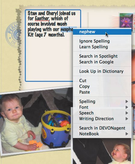 | Figure 7.34. To replace a misspelled word with one of iPhoto's guesses, Control-click the word and choose a guess from the contextual menu.  Tips  | Happily, after four broken versions, Apple finally fixed Check Spelling As You Type in iPhoto 6 so that it's on by default and stays on all the time. Be sure to click every text box before ordering to look for red underlines, since iPhoto won't mark misspellings until you click the text box that contains them. Ignore Spelling isn't particularly worthwhileiPhoto forgets ignored text between launches.