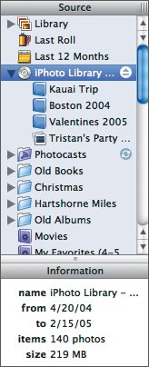 Figure 2.11. iPhoto discs appear in your Source pane with any albums on the disc showing up under the disc name.  | 2. | Select one or more photos or albums, and then drag them to your Library album to import them just into the Library, into an album to import them and add them to that album (Figure 2.12), or to the bottom of the Source pane to import them and create a new album.