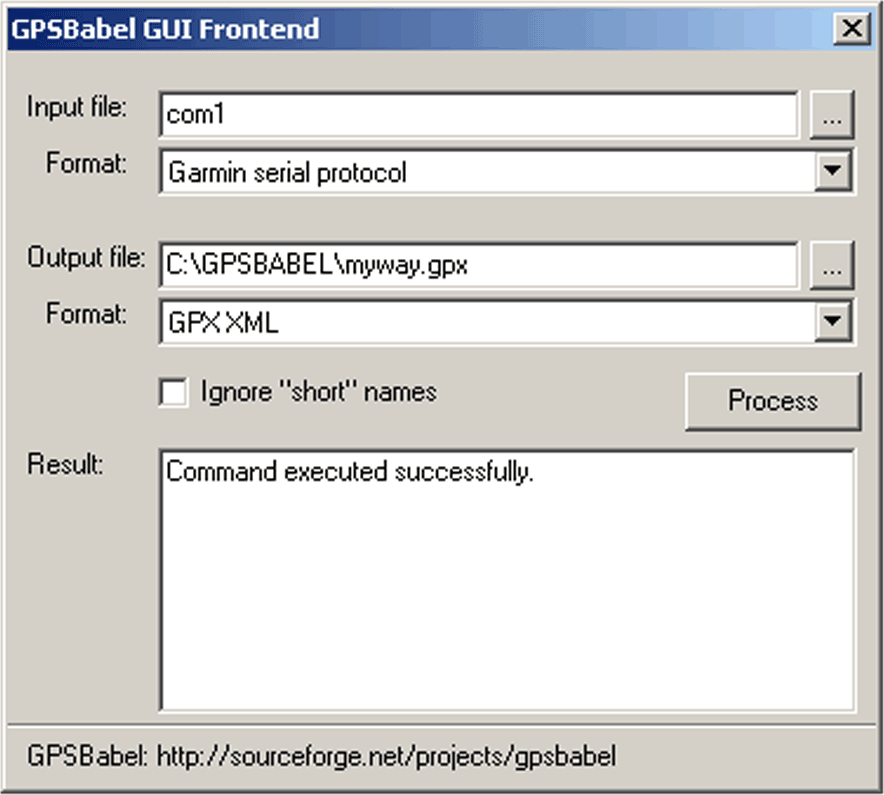 Figure 5-4 shows the Windows version of GPSBabel, set up to read waypoints from a Garmin GPS via the serial port, com1, and save them to the GPX format file named waypoint.gpx.