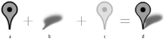 Figure 7-3. Google Maps pushpin icon parts: (a) the pushpin image, (b) the shadow, (c) the click target for IE, and (d) the resulting icon