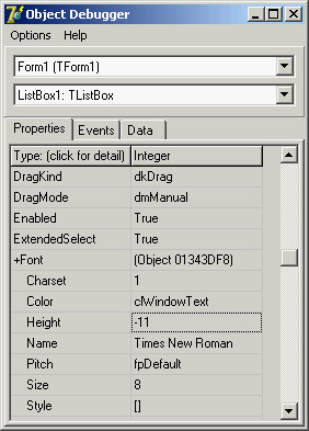 At design time, you can use the Object Inspector to set the properties of the components of your forms and other designers. In Delphi 4, Borland introduced a run-time Debug Inspector, which has a similar interface and shows similar information. Before Borland added this feature, I implemented a run-time clone of the Object Inspector meant for debugging programs: